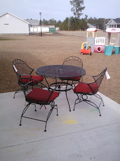 Back when we moved, we made a list of things we'd like to have, and numbered them according to what should be purchased first and so on. As money allows, we've been replacing things and adding things to our new home. Slowly we're knocking off stuff and getting to the true wants, and not the needs. (it helped that my dad found a 32" flat screen in the garbarge and traded us for a TV that we were given.) I love our trash TV!! Scratch that off the list! So, with that being said, we bought a patio set for the back yard, and some porch rockers for the front.